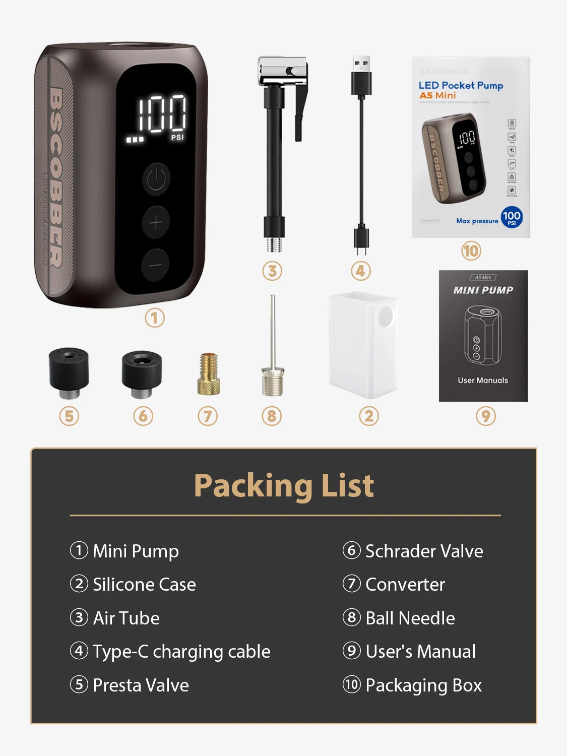 **Ultimate Convenience for Cyclists** The BSCOBBER A5mini Portable Air Pump is the quintessential companion for cyclists seeking an efficient and lightweight solution for maintaining their tire pressure. Designed with the cyclist in mind, this tiny pump boasts a sleek and compact design that fits easily in your pocket, making it an ideal bike accessory for on-the-go inflation. Its lightweight build at just 98g ensures that you won't feel the burden of carrying an additional accessory during your rides. **Powerful Performance for All Cycling Conditions** With a high-pressure output of 100PSI, this tire inflator is capable of refilling your tires quickly and efficiently. Whether you're out for a leisurely ride or tackling challenging terrains, the BSCOBBER A5mini has got you covered. The rechargeable battery with a Type-C charging interface ensures that you can power up your pump whenever you need it, without the hassle of replacing batteries. The easy-to-read large display screen allows for precise control over your tire pressure, ensuring that you maintain optimal performance and safety on the road. **Designed for Versatility and Ease of Use** The BSCOBBER A5mini is not just a bike accessory; it's a versatile tool that adapts to your needs. With its Schrader and Presta valve compatibility, switching between tire types is a breeze. The integrated air nozzle is anti-scalding, making it safe to use on TPU tires. The pump's intelligent design includes a self-supporting inflation feature, allowing you to plug it in and walk away while it does its job. The pump's resilience is evident in its ability to inflate 2-3 tires on a single charge, making it a reliable companion for any cycling adventure.