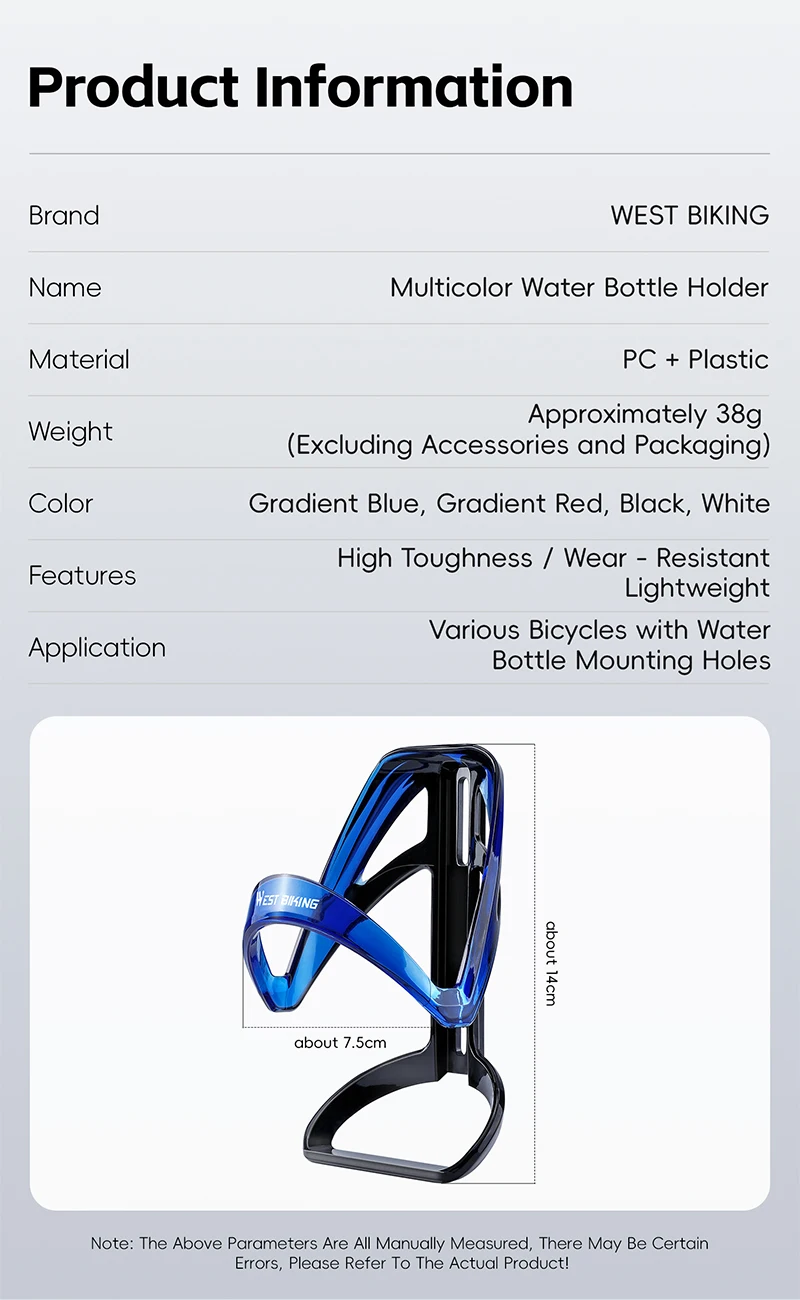 The WEST BIKING Bicycle Bottle Holder boasts a lightweight design, weight approximately 38g, ensuring minimal impact on your bike's speed and agility.